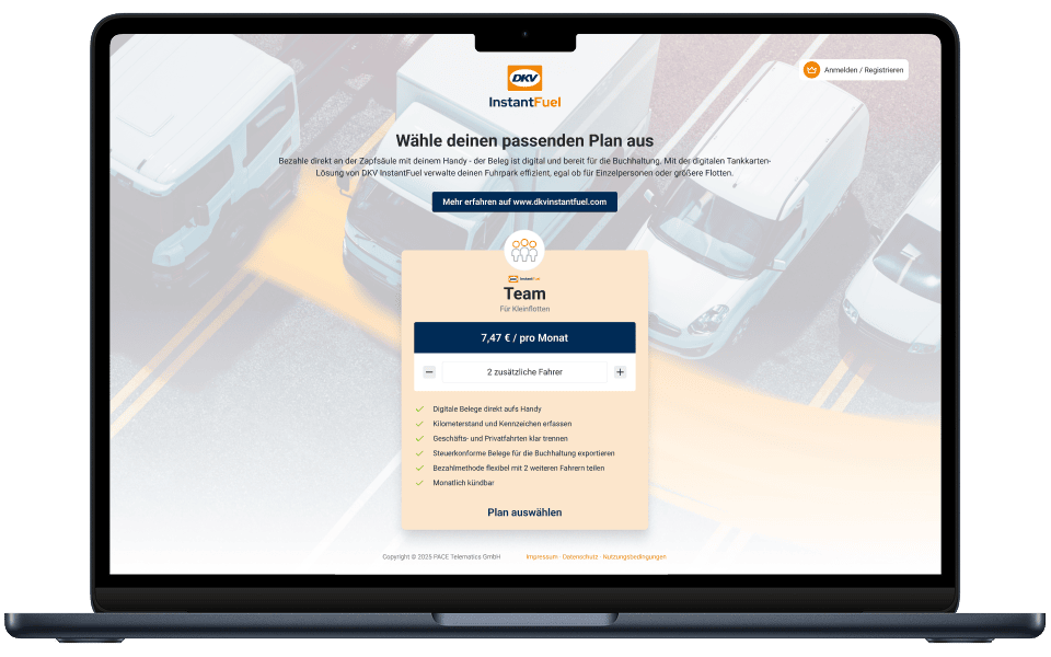 Die Lösung ist ideal für kleinere Unternehmen und Teams (1-20 Fahrer), die ihre Tankbeleg-Verwaltung schnell und unkompliziert digitalisieren möchten. Sie können sofort starten, da keine zusätzliche Überprüfung erforderlich ist.