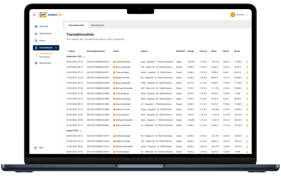Sie erhalten für jede Transaktion automatisch einen finanzamtkonformen, digitalen Beleg. Im DKV InstantFuel Dashboard können Sie alle Belege und Transaktionsdaten als steuerkonformen Export (z.B. eine übersichtliche PDF-Liste) für Ihre Buchhaltung oder Ihren Steuerberater herunterladen.